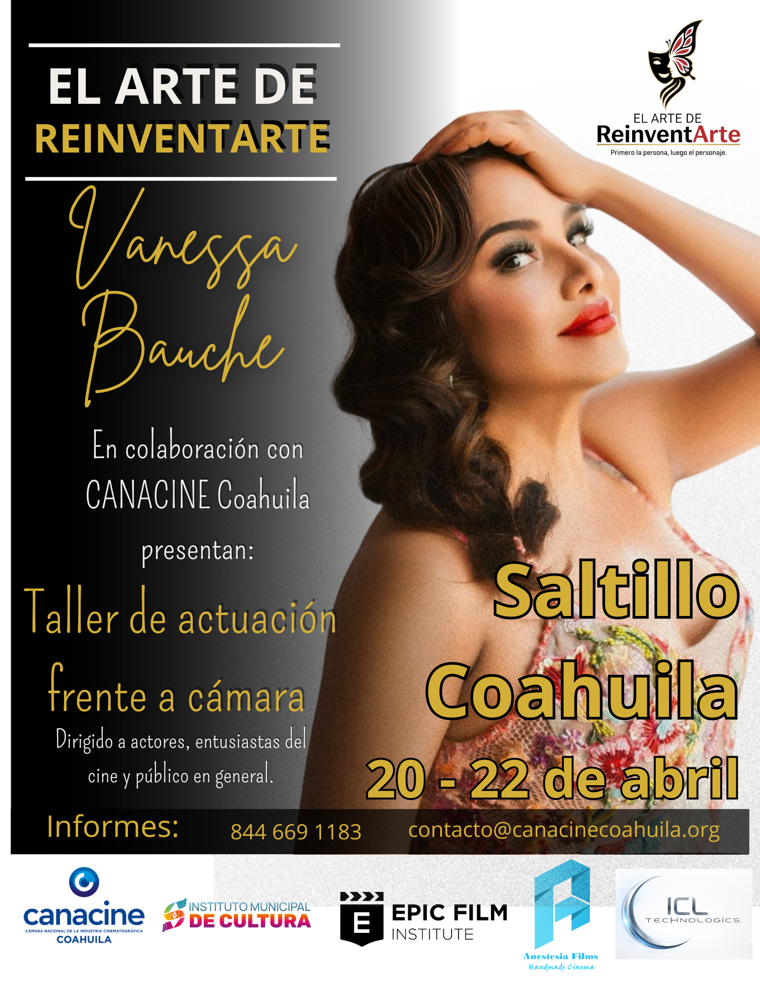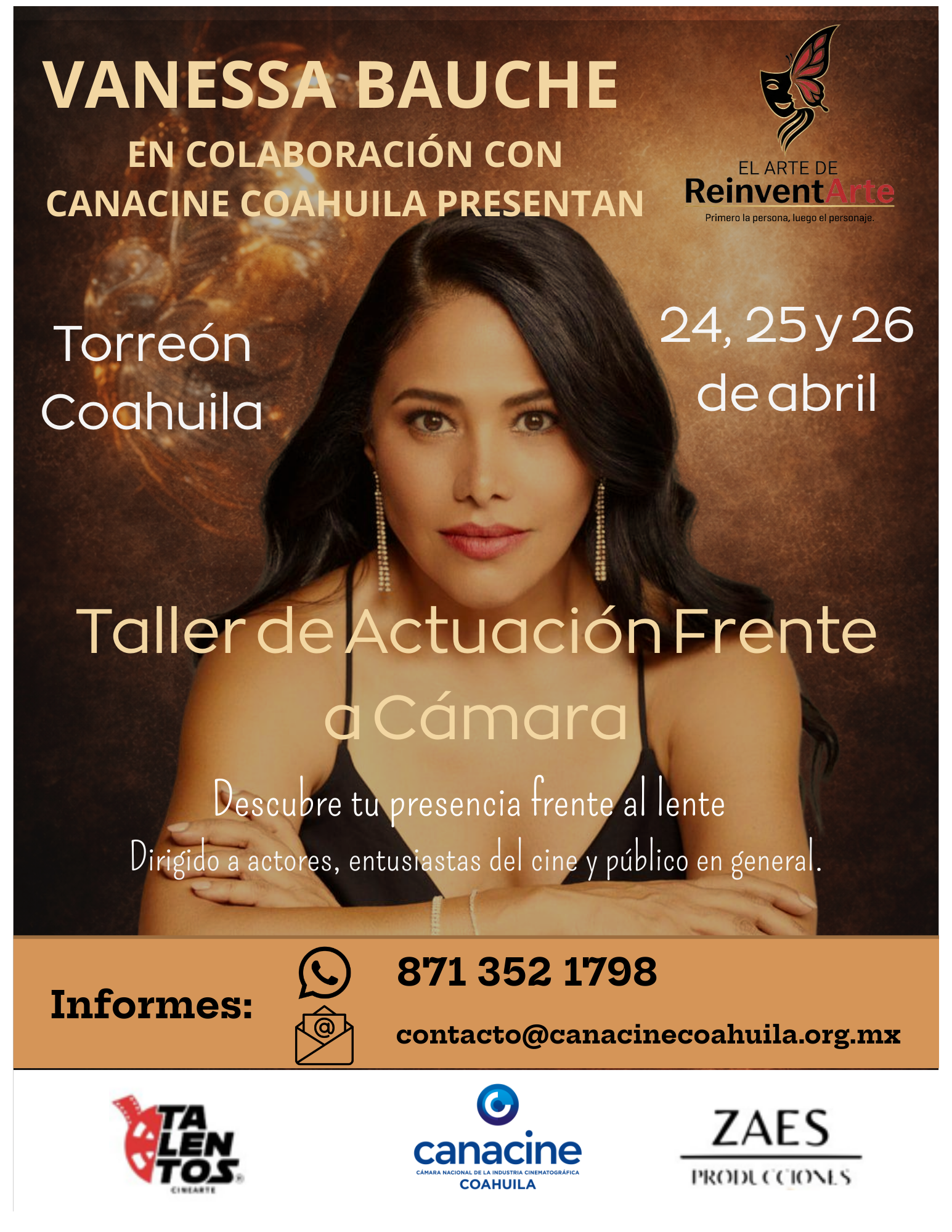 Una oportunidad única de profesionalización en Coahuila. Taller intensivo de técnica actoral impartido por la reconocida actriz y productora Vanessa Bauche.